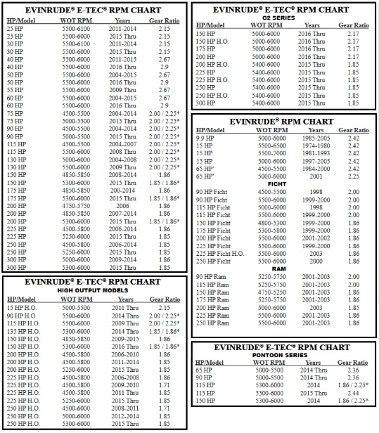 Differences in engine design, gearcase ratios, and production years mean that recommended RPM ranges are not universal. The Evinrude propeller chart below summarizes commonly published WOT RPM ranges drawn from manufacturer data and propeller industry references.